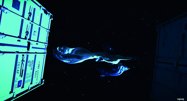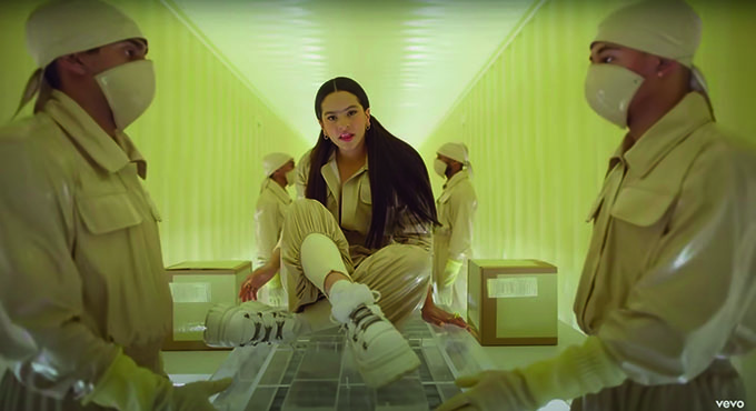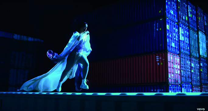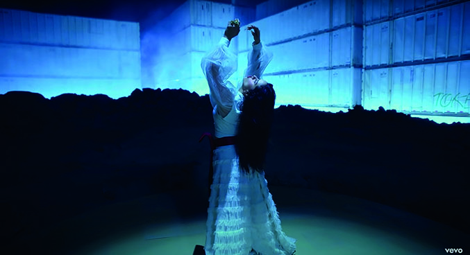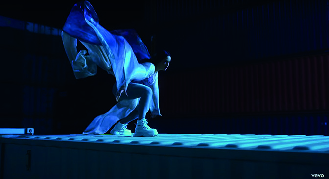 En cuanto a los tres looks que aparecen en el video, el primero es un boiler suit color blanco (Fig. 10), el cual sigue una tendencia bastante popular en el 2019. Otro de los looks se trata de un body con aplicaciones en color lila, el cual acompañó de una capa de gasa en la misma tonalidad y unas botas blancas de Buffalo (Fig. 11). El último look pensado por Samantha Burkhart (quien ha trabajado con personajes como Lady Gaga) consistió en un conjunto de piel color café, sin una pierna y un body en tono nude con aberturas en la cintura y el esternón (Fig. 12).