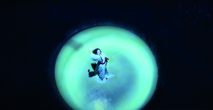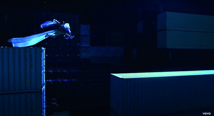 En el primer escenario (A), y durante los primeros 30 segundos, la mayoría de los ángulos son en picado o frontal, lo que nos refleja una Rosalía que pone al espectador por encima de ella. En ese tiempo su mirada es elusiva y las secuencias son de entre 4 y 9 segundos. Después del cambio de ritmo, cuando Rosalía aparece en este lugar los planos son frontales e incluso llegan a ser contrapicados lo que refleja una superioridad recién adquirida. Sin embargo, aún esconde la mirada con su pelo, de una forma deliberada cuando baila. Además, es a partir de entonces que se ven pequeños paneos rápidos y secuencias de menos de 4 segundos (Fig. 15).