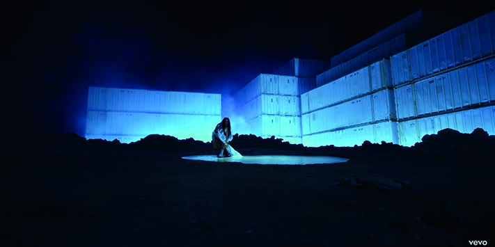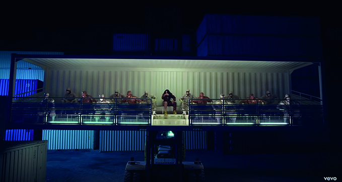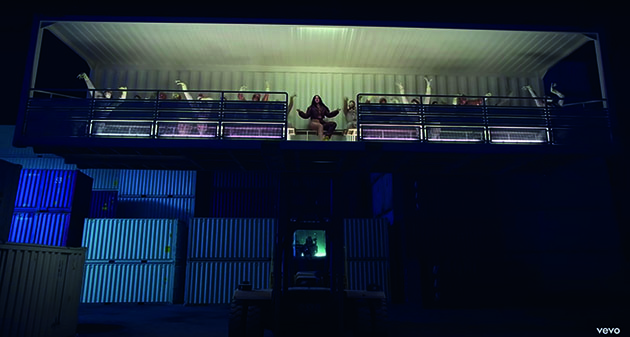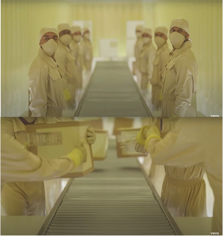 El segundo escenario (B) es Rosalía nos muestra un lado más íntimo, ya que por lo general está en primer plano, nunca deja de ver directamente la cámara, la cámara casi no se mueve y ella no baila. Aunque se encuentra sobre la banda industrial como si fuera una caja más (equiparando como un producto industrial) su mirada es desafiante e incluso hace muecas de desprecio (Fig. 16).