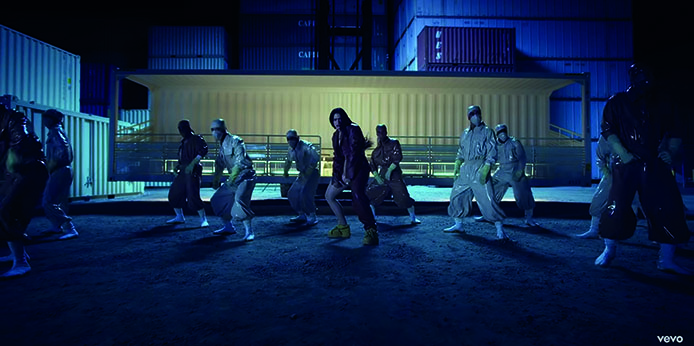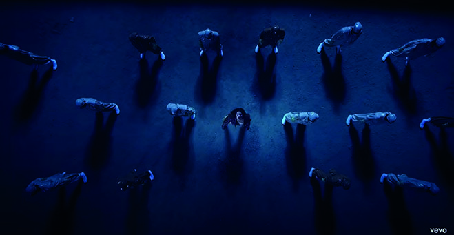 Al final, en el último escenario (E) la vemos bailando rodeada de bailarines, los planos se abren todavía más y aunque todavía ve fijamente a la cámara, pero a veces ya no lo hace y sin la necesidad de cubrir su rostro, lo que nos dice que se siente cómoda viendo a la cámara, pero ya no tiene la necesidad de sostener la mirada (Fig. 19).