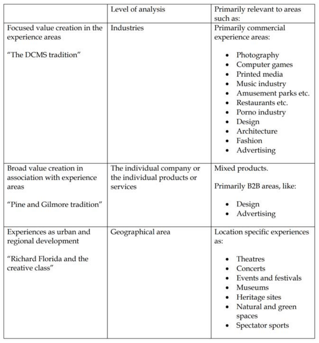 Reading the Danish and Scandinavian books and reports published about the experience economy, it becomes clear that the Scandinavian use of the concept of experience economy seems to have derived from a mix of three different approaches and theories. Firstly, is Pine and Gilmore’s book The Experience Economy (1999); secondly, the focus on creative industries in the United Kingdom with the first mappings of creative industries (DCMS 1998, 2001); and thirdly, Richard Florida’s book The Rise of the Creative Class (2002). These three approaches together seem to represent the core of the experience economy wave that has spread in Denmark and several other countries, particularly in the Scandinavia. Each of the three approaches has something to do with experiences and creativity, but otherwise, they have little in common (Bille, 2012, 97).