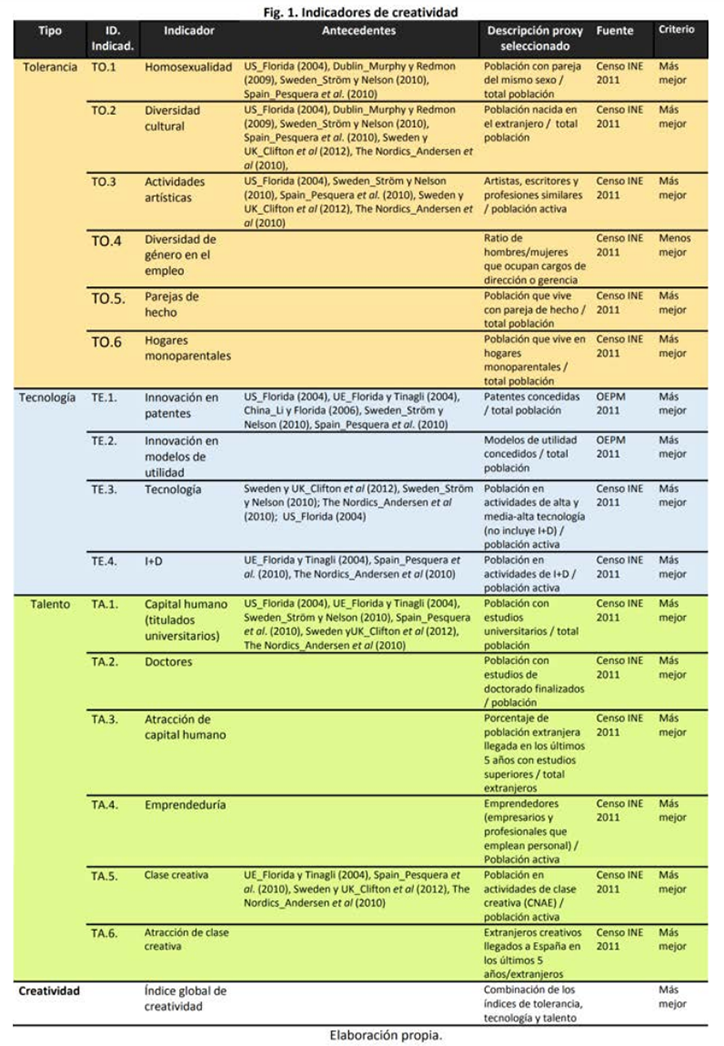 Reverté et al., (2016) have applied the Richard Florida’s theory to touristic cities from the Spanish Mediterranean system (see the following Figure. 5. ‘Indicadores de creatividad’), where Girona is implied as a provincial capital. However, Girona was never named – neither as city or as province. But such indicators do form part of the experience economy. A list with several other indicators that could contribute to analyze the experience economy at Catalonia’s cities is present by AQR-IREA (2007, 6-9).