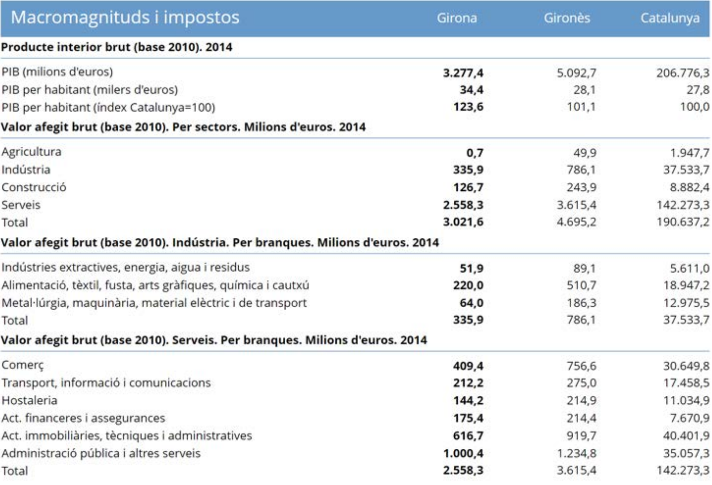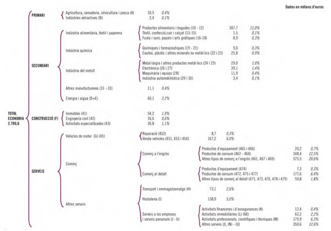 When measured by the Gross Domestic Product (GDP) in dollars, the sector of services represent 78,06 % of Girona’s economy, followed by the sector of industry with 10,25 % of the total. The main components of services are public administration and other services (30,52 %), realtor/technical/administrative activities (18,82 %), commerce (12,49 %), transport/I&C (6,47 %), finance/insurance (5,35 %), and hotels (4,40 %) – making 78,05 % of the total. The internal distribution for industry is food/textile/wood/chemical/graphic/cork (6,71 %), extractive/energy/water/waste industries (1,58 %), and metal/machinery/electric/transport material (1,95 %). However, there is a way to deepen the analysis of the Girona’s economy, showing a more complete internal partition for each sector.