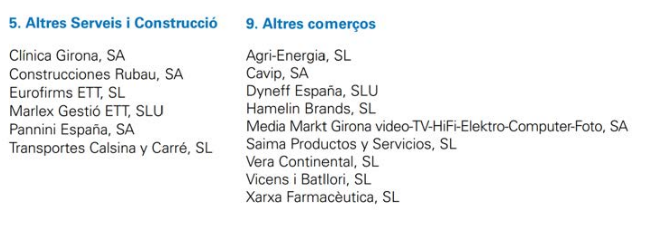 From there, it is clear that the Girona’s economy is widely based on services (78,6 %) and industry (14,5 %) with the major participation from other types of wholesale commerce (22,4 %), retail/wholesale consumption products (19,2 %), other services (11,8 %), food/beverages (10,5 %), and professional/scientific/technical activities (6,1 %) – that sum up together 70 %. One may note a difference between the numbers presented by IDESCAT and Perfil de la Ciutat: at IDESCAT the GDP is $3.277.400 euros, whereas the value depicted at Perfil de la Ciutat is $2.790.677 euros. Going beyond that, a generic category labeled as “other types of” does really few to shed light over the economy’s structure. For example, at the Ajuntament de Girona’s appraisal, other “types of retail” accounted by 25,48 % of the category commerce, while “other services” represented 41,18 % of the category services5. At the IDESCAT analysis, the “public administration and other services” responded for 30,52 % of the services sector; whereas at the Perfil de la Ciutat “other types of wholesale commerce” and “other services” expressed 22,4 % and 11,8 % of the sector services – respectively. A manner to contour such generality may be given by the KPMG annual report Girona100.