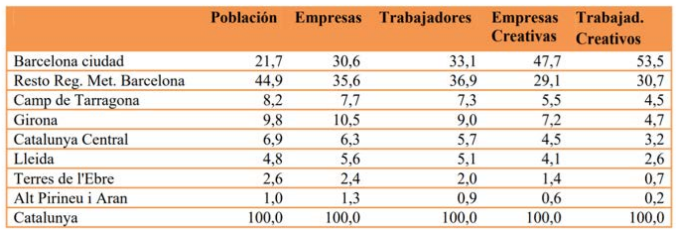 The creative economy represents 6,1 % of the world’s Gross Domestic Product (2.700 billion of dollars), while the exports of creative goods and services reached 3,4 % of the total worldwide (424 billion of dollars) (Area Metropolitana de Barcelona, 2011, 71). In Europe, both the creative and cultural industries generated 3,3 % of the GDP, and have employed 3 % of the working force (6,7 million of persons) (Azqueta, 2014, 1). Differently, EY (2014, 10) says that “creative and cultural industries (CCI) contributed with 4,2 % of Europe’s GDP”. In Spain, the creative and cultural sectors provide with 3,9 % of the country’s GDP – average between 2000-2008 (Barcelona Treball, 2013, 17). The region of Catalonia has been close to such mark, with 3,1 % of GDP, 6,6 % of the working force, and 6.6 % of the companies as well (Generalitat de Catalunya, 2014, 58-59). If one takes the industries based on experiences (that aggregate creative and cultural industries, tourism, and sports), they account for 16% of the GDP and 19 % of the employments (Generalitat de Catalunya, 2013, 17). The capital Barcelona concentrates 46,8 % of all creative jobs in Catalonia, and has a creative sector that employs 11,3 % of the city’s working force and involves 10,9 % of the companies. (Ajuntament de Barcelona, 2015, 10).