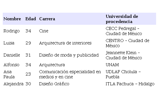 La mayor parte de los entrevistados están entre los 23 y los 34 años, justo el rango de edad de la población más activa económicamente. La mayoría de ellos ha estado en empleos con condiciones complicadas, sobre todo por el tema de los horarios, cargas de trabajo y sueldos. Algunos de ellos han optado por independizarse y formar sus propias empresas debido a que las oportunidades laborales son limitadas y los empleos no les ofrecen suficiente ingreso para vivir. Sin embargo, trabajar por cuenta propia resulta una mejor opción, aunque castigan las prestaciones de ley como el seguro social o el fondo de ahorro. Para un sector de la población las prestaciones son importantes para mejorar su calidad de vida, para otro sector no son necesarias, tal como lo expresa uno de ellos: “El seguro social es algo personal, cualquier persona puede tenerlo si así lo quiere, pero en México no es muy solicitado a menos que seas de una clase muy baja y obviamente favorece, pero cada quien tiene más opciones y mejores” Hombre, egresado de Cine.