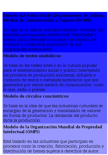 Para comprender las industrias creativas desde su estructura y cómo han evolucionado, algunos países han elaborado modelos para clasificarlos y comprenderlos. Son cuatro los modelos que han estudiado a la industria creativa y han intentado clasificarla (consultar la clasificación y profesiones de estos y otros organismos en anexo 1). En el siguiente cuadro se muestran los cuatro modelos y su característica principal: