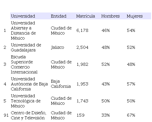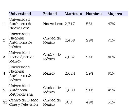 En este ranking, la UIA-Ciudad de México se encuentra en el #23 con 558 estudiantes. El Tecnológico de Monterrey-Ciudad de México en el #38 con 420 alumnos. Por su parte la Anáhuac del Edo. de México está en el lugar #40 con 404 estudiantes y el campus D.F. en el #121 con 100 matriculados.