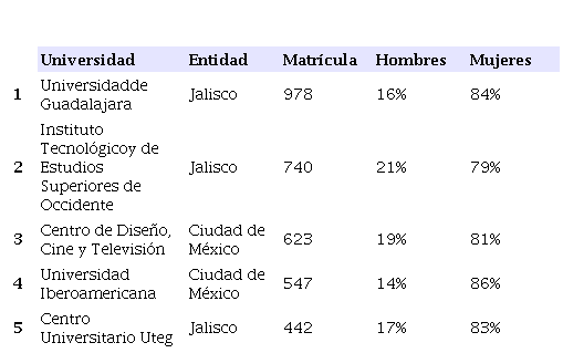 La mayor parte de las universidades donde se ofrece algún programa relacionado a la industria creativa se encuentran en el centro (Distrito Federal, Hidalgo, México, Morelos, Puebla y Tlaxcala) y centro occidente del país (Aguascalientes, Colima, Guanajuato, Jalisco, Michoacán, Nayarit, Querétaro, San Luís Potosí y Zacatecas). Así pues, es posible ubicar que el centro del país tiene una fuerte influencia por los sectores creativos y que esta aglomeración ha conformado redes de producción que a su vez generan más productos y servicios creativos.