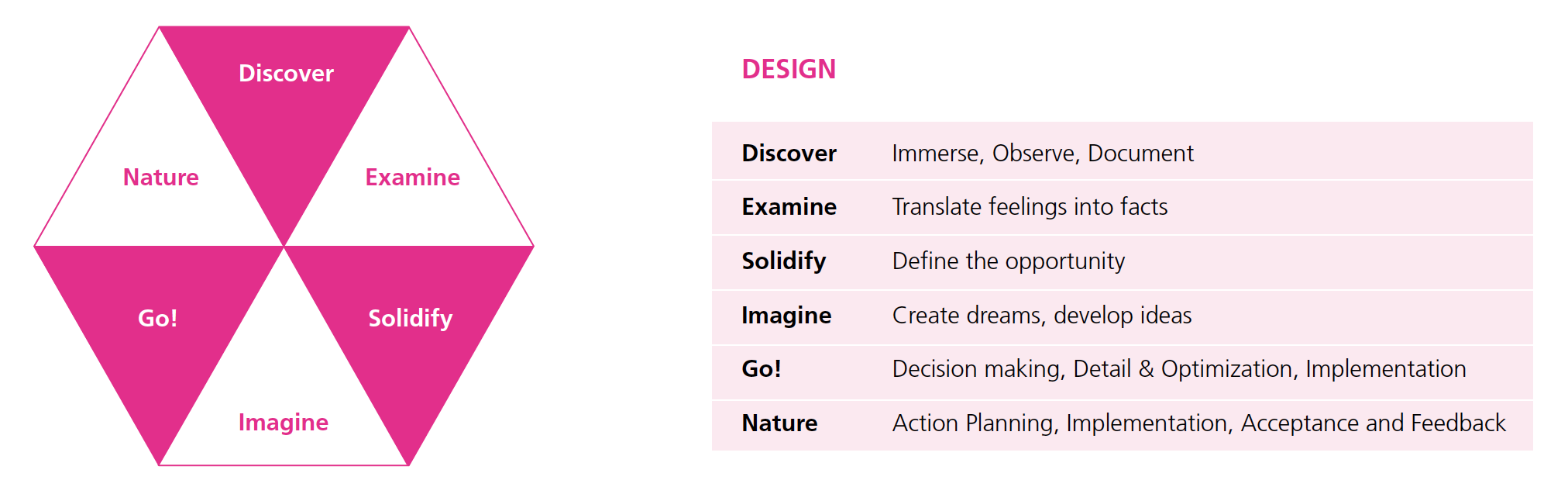 Abstract: This paper presents the model D.E.S.I.G.N. (Discover, Examine, Solidify, Imagine, Go, Nurture), which functions as a navigation guide for designers. The respective steps are illustrated by cases that have helped to inspire and refine the described procedure and the tools used on each example. The work highlights the importance of the user-centered design has for creating and implementing workable solutions.