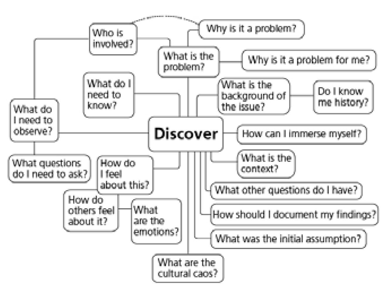 El descubrimiento conlleva preguntas como las siguientes: ¿Cómo me siento al respecto? ¿Cómo hace sentir esta idea a las demás personas? ¿Cuáles son las preguntas que necesito hacer? Así que esta es la búsqueda, este es el modo de indagación, ¿Cuál es el problema? ¿Por qué es un problema? ¿Cuál es el trasfondo? ¿Cuál es el contexto? En esta etapa es necesario hacer etnografía, investigación contextual, observación, mapas de viaje del consumidor (Underhill, 2008), cualquier técnica que nos lleve al usuario y a su experiencia de manera formal y sistemática. No diseñes para ellos, diseña con ellos. Crea en conjunto con los usuarios.