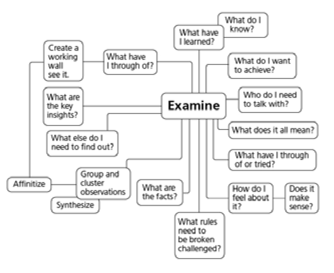 En esta etapa debemos preguntarnos ¿qué es lo que pensado y probado?, ¿con quién necesito hablar? ¿Qué significa todo esto? ¿Qué es lo que he pensado y probado? ¿Cuáles son los datos? ¿Qué reglas necesitan romperse? Todas estas ideas deben sintetizarse y agruparse, con frecuencia como mapas mentales para facilitar la conexión de los puntos.