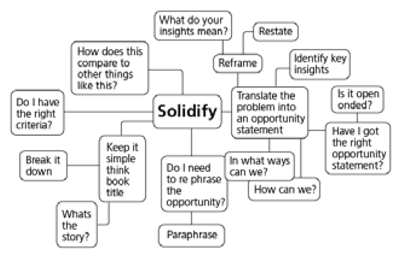 Hablemos ahora de Solidificar. Transformar un problema en oportunidad pareciera una re banada pequeña del pastel, pero su importancia es crítica. Al pensar en el problema debemos preguntarnos: “¿Cómo podemos…?” Desarrollar un brief servirá para alcanzar más claridad sobre el problema, narrar una historia acerca de las circunstancias también será de gran utilidad.