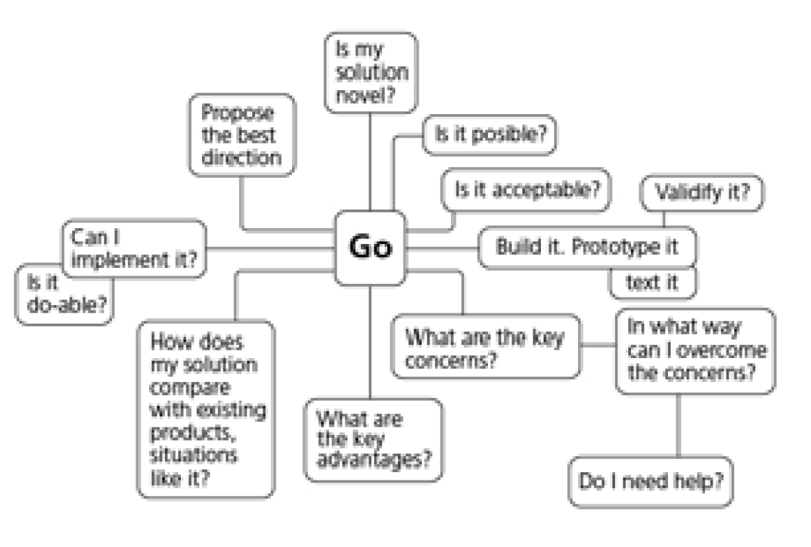 Con frecuencia escuchamos que es preciso generar una gran cantidad de ideas, pensar de forma lateral (De Bono, 2000/1970), mantener las alternativas abiertas. Esta es una fase altamente divergente y en ella encontraremos unos cuantos temas que encabezan las soluciones: aún no debemos lanzarnos a conclusiones apresuradas, debemos evaluar los pros y contras de cada idea, enlistar los atributos positivos y las preocupaciones asociadas con éstos; después debemos pensar en formas de superar esas preocupaciones. Por lo general, este contenido se convertirá en bloques de construcción de las posibles soluciones; al enfatizar en los atributos positivos, comenzaremos a visualizar soluciones sobre las cuales podemos enunciar oportunidades.