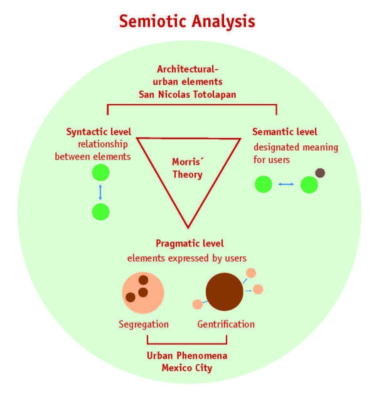 The text begins with the definition of concepts of two different urban phenomena such as urban segregation and gentrification, from the perspective of hierarchical social organization based on the symbolism of identity. These phenomena are explained through the triadic model of Charles Morris, who takes up the semiotic principles of Charles Sanders Peirce from a social behavior approach. The hypothetical-deductive semiotic method allows the analysis for a particular case - the identification and correlation of the minimum elements that make up the object of study, the architectural-urban elements of the San Nicolas Totolapan neighborhood, and how a group perceives them - to understand the urban phenomena that occur in a generalized manner in Mexico City and throughout Latin America from the perspective interested in the symbolism and cultural value of urban space. The application of semiotics in this study is relevant as the chosen method and theory provide a framework to elucidate how signs (images, textures, colors, materials, among others) function as modes for communication and have the cultural value that can be interpreted for the creation of meanings and concepts used in society. Likewise, it offers insight into the construction and negotiation of identities, societal cultures, and the collective ideology constructs implicated in developing complex phenomena such as segregation and gentrification.