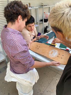 Elección de diseño y análisis de tablas de skate. Cada participante revisó los manuales para decidir qué tipo de mueble fabricar. Mientras revisaban los manuales, el equipo estudiantil se acercó a cada participante para revisar las particularidades de sus tablas y aconsejarlos para el tercer ejercicio.