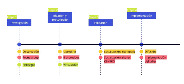 El equipo de trabajo se conformó por dos estudiantes y un egresado de Diseño industrial, así como por la persona responsable de Comunidad C. El proceso se dividió en 4 etapas: 1) investigación 2) ideación y prototipado 3) validación 4) implementación (véase Figura 5). Estas etapas se basaron en el modelo de doble diamante, que sugiere las fases de descubrimiento, definición, desarrollo y entrega (Design Council, s.f.). La inclusión de una etapa exclusiva para la validación del proyecto se consideró importante para centrar al equipo en las necesidades de los usuarios finales e incentivar un proceso de diseño horizontal. A continuación, se describe a profundidad cada una.