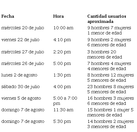 Como se muestra en la Tabla 1, se hicieron 9 visitas en diferentes horarios y días durante julio y agosto de 2022.