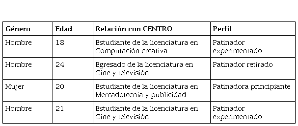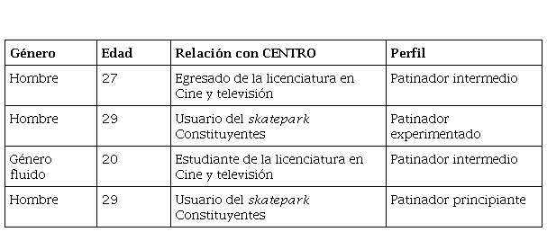Este método se aplicó el 29 de agosto de 2022 con cuatro entrevistados (véase Tabla 2) mediante una convocatoria abierta publicada en el Instagram de Comunidad C. En la publicación se invitaba a patinadores, de preferencia usuarios de Consti, a ayudar con un proyecto sobre esta actividad.
