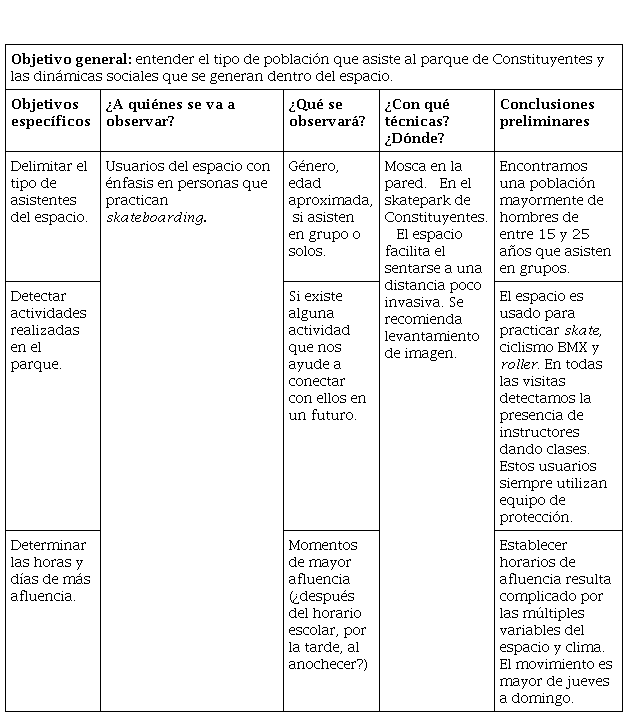 Para delimitar la pauta de observación (véase anexo A), se adaptaron las plantillas 1.6 A y 1.6 C (Figueroa et al., 2017) con el objetivo general de entender qué tipo de población asiste al parque de Constituyentes y las dinámicas sociales que se generan dentro del espacio, usando la técnica mosca en la pared (Martin et al., 2012, p. 90).
