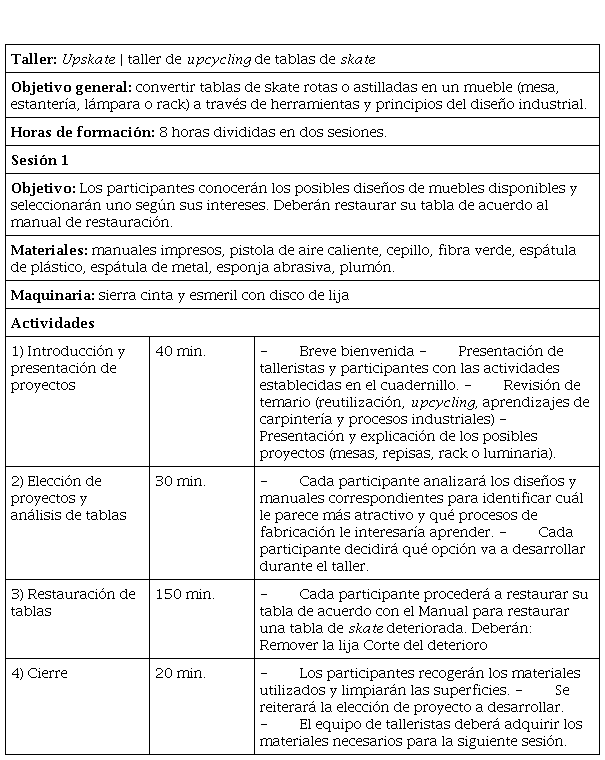 Para una segunda edición se recomienda ajustar los tiempos establecidos. Esto se debe a dos factores: la diversidad de tablas y retos que se pueden presentar al momento de remover la lija; y la necesidad de los participantes de imprimir su propia esencia en cada mueble, lo que puede requerir pasos adicionales no contemplados en los manuales de trabajo3.