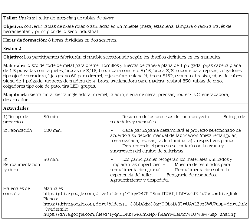 Resumen: Este escrito documenta y comparte los hallazgos encontrados en el codiseño e implementación de Upskate: taller del upcycling de tablas de skate que tuvo como objetivo fomentar los vínculos entre las personas que comparten el interés por el skate en el área de influencia de CENTRO. Los participantes transformaron sus tablas rotas o astilladas en muebles reaprovechando de esta manera los desechos de esta práctica. Los hallazgos del estudio sugieren que la colaboración entre diseño difuso y experto puede ser una forma eficaz para fomentar la construcción de comunidad. El escrito explora la historia del skate y su relación con la creatividad, el desarrollo del skatepark de Constituyentes y la misión del Hub de diseño social de CENTRO. Posteriormente, describe la metodología, las etapas del proyecto y sus resultados e impacto en ambas comunidades.
