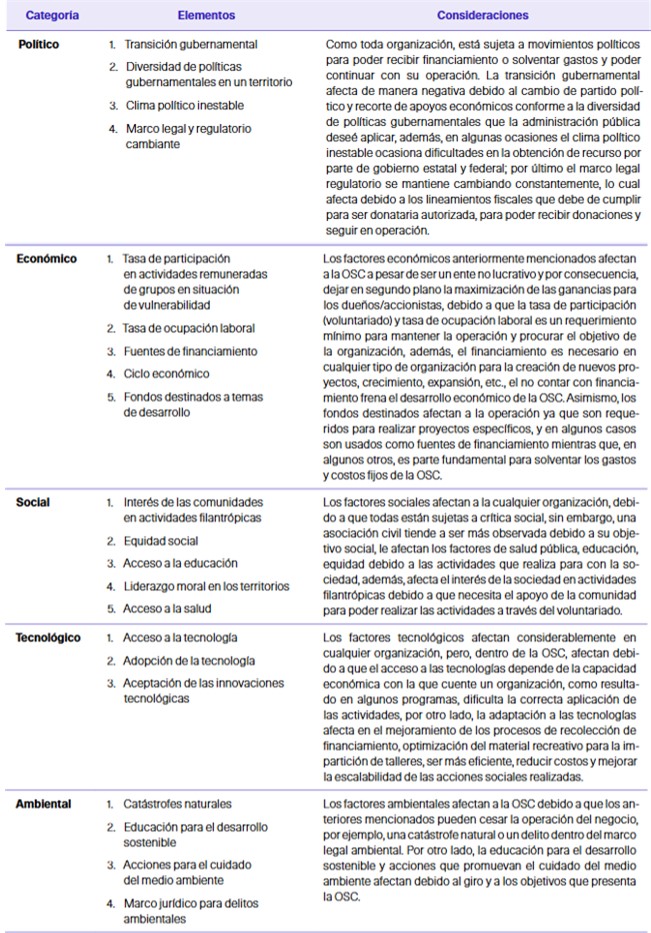 Al contar con la información resultado de la investigación documental, se realizó una entrevista con miembros de la OSC para conocer su percepción por los elementos externos considerados. Así, se pudieron incluir nuevos factores que, con su mayor conocimiento sobre la operatividad de la organización, debían ser considerados y, se marcaron elementos que, desde su punto de vista, no tenían incidencia.