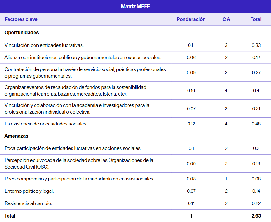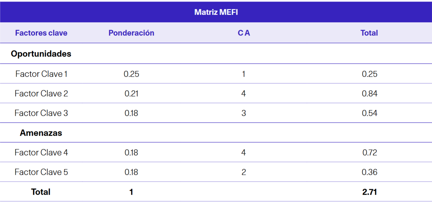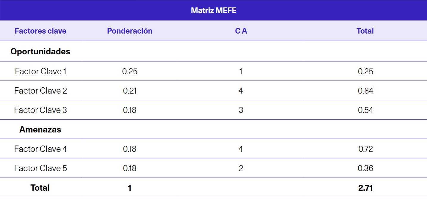 Para la construcción de la MEFE se asignó una ponderación a cada factor clave (cuya sumatoria debería ser igual a 1), para, posteriormente, multiplicar la ponderación por la calificación para obtener un resultado. La calificación se establece seleccionando un valor de 1 para una amenaza menor; 2 para una amenaza mayor; 3 para una oportunidad menor; 4 para una oportunidad mayor.