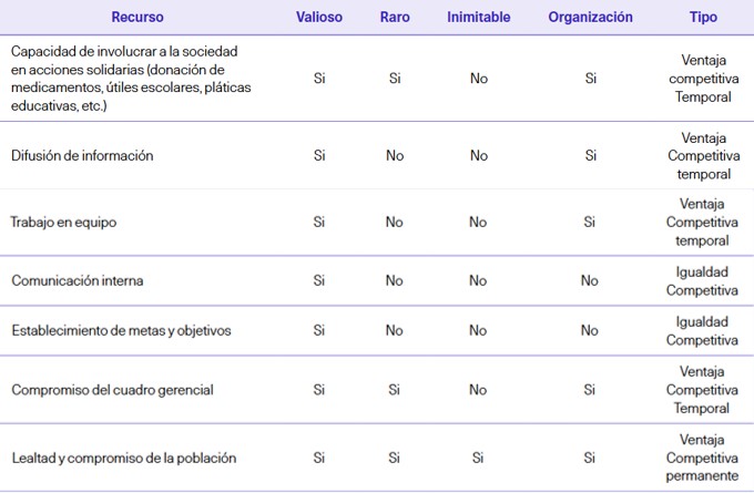 Por lo anterior, se puede determinar que el capital intelectual es un recurso que les proporciona una ventaja competitiva sostenible debido a que en este tipo de organizaciones puesto que el conocimiento adquirido por la experiencia no se sustituye, no se imita, es valioso y raro debido a que no todos pueden realizar este tipo de actividades. Además, la red de contactos es un recurso valioso y no sustituible debido a que es de mucha importancia dentro de la organización, sin embargo, dentro de las asociaciones civiles es muy común tener este tipo de contactos por lo que no es ni raro ni inimitable. Se puede considerar que este recurso genera una ventaja competitiva temporal.
