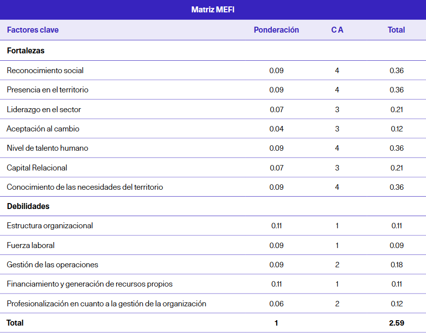 En relación con el análisis de los elementos positivos y negativos internos de la OSC, se efectuó la MEFI considerando la información recabada en los diversos grupos de enfoque. Su construcción sigue una mecánica similar a la descrita para la MEFE. La Figura 14 muestra los resultados del análisis correspondiente.