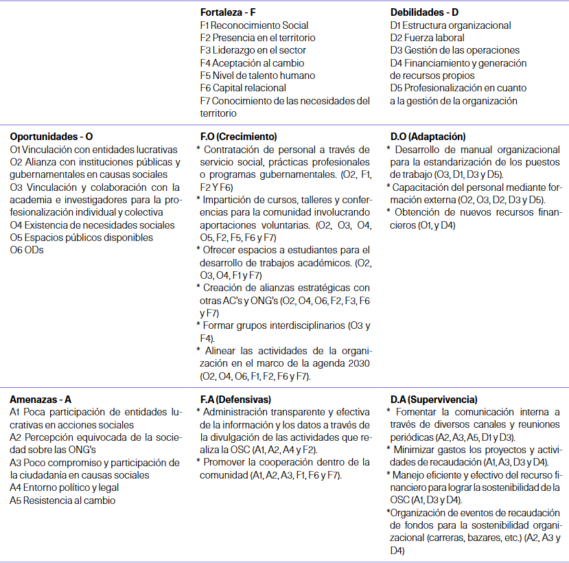 Se ponderaron los factores de acuerdo con su relevancia, asignándoles una calificación (1 para una debilidad menor; 2 para una debilidad mayor; 3 para una fortaleza menor; 4 para una fortaleza mayor) y posteriormente obteniendo un resultado, la suma de todos los resultados, representa la evaluación final. Dentro de la OSC obtuvo una calificación total de 2.59, lo cual significa que está por encima de la medida, teniendo ciertas debilidades, las cuales tienen área de mejora, sin embargo, sus fortalezas mantienen a flote la operación y el funcionamiento de la OSC, las por lo que se puede decir que la organización social tiene una estructura interna fuerte. Finalmente, con la MEFI y MEFE se determinaron las acciones estratégicas, mismas que se exponen en la Figura 15. Cabe señalar que, las acciones estratégicas propuestas se realizaron considerando la misión y visión de la organización, también, para considerar a las actividades como viables, mediante la consulta directa con sus miembros se obtuvo su aval como actividades factibles y pertinentes.