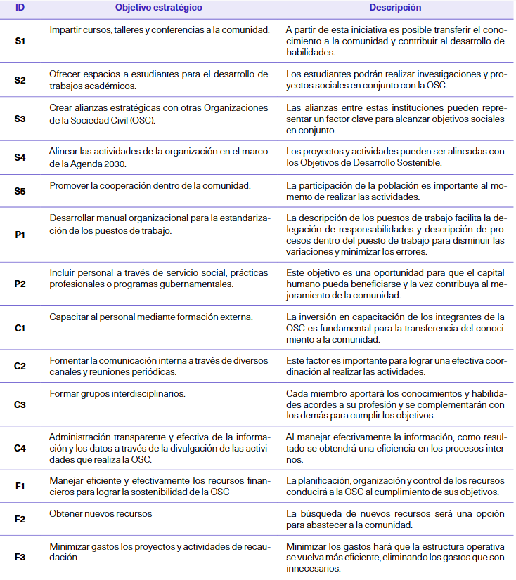 Como primer paso para la implementación de los instrumentos para desarrollar la planeación estratégica, se efectuó un grupo de enfoque con las integrantes de la OSC para establecer el objetivo de la intervención estratégica, lo cual, servirá como la guía para poder formular las acciones estratégicas partiendo de los análisis. En este sentido, se determinó como meta el diseñar un plan estratégico que coadyuvará a la OSC a poder realizar actividades de manera sostenible, privilegiando la eficiencia, tanto operativa como administrativa, lo que le permitiría cumplir la misión de fomentar el desarrollo humano e integral mediante acciones que promuevan el empoderamiento, así como la visión de ser el principal agente de cambio con empoderamiento de niños, jóvenes y mujeres en su área geográfica de influencia.