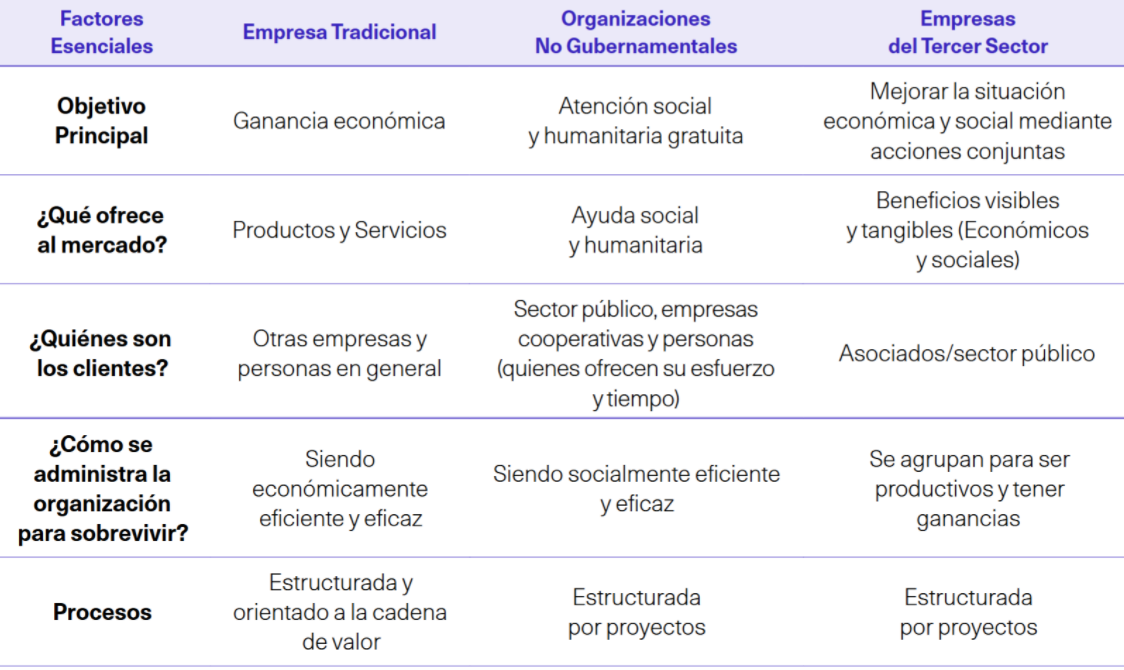 Considerando lo anterior, existe una amplia tipología (Ver Figura 1) de organizaciones que pueden caer en la denominación anterior, sin embargo, para tener un mejor panorama sobre este tipo de empresas, Gil-Estalloet al.(2006) enmarcan las principales diferencias respecto a las empresas tradicionales, siendo la priorización de las ganancias económicas, la orientación a mercados meta más amplios y un enfoque centrado en el estudio o análisis de las actividades operativas las características de estas últimas, lo cual, se contrapone a una visión más humanista, la prelación del beneficio económico, la delimitación de un nicho de beneficiarios, que corresponden a la empresa social.