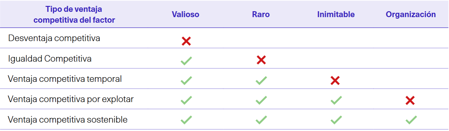 Continuando con la evaluación interna, tomando como cimiento los planteamientos de Barney (1991), se requiere la evaluación de los recursos y capacidades de una empresa, para lo cual, el análisis VRIO (Ver Figura 5) permite identificar a los generadores de una ventaja competitiva, misma que debe de ser Valioso, Raro, Inimitable, en relación con la competencia. Se entiende como recurso a todos aquellos elementos que contribuyen a la producción de la empresa, tales como los recursos materiales, talento humano, finanzas y todo aquel activo que esté involucrado en la transformación del bien o en la prestación del servicio.