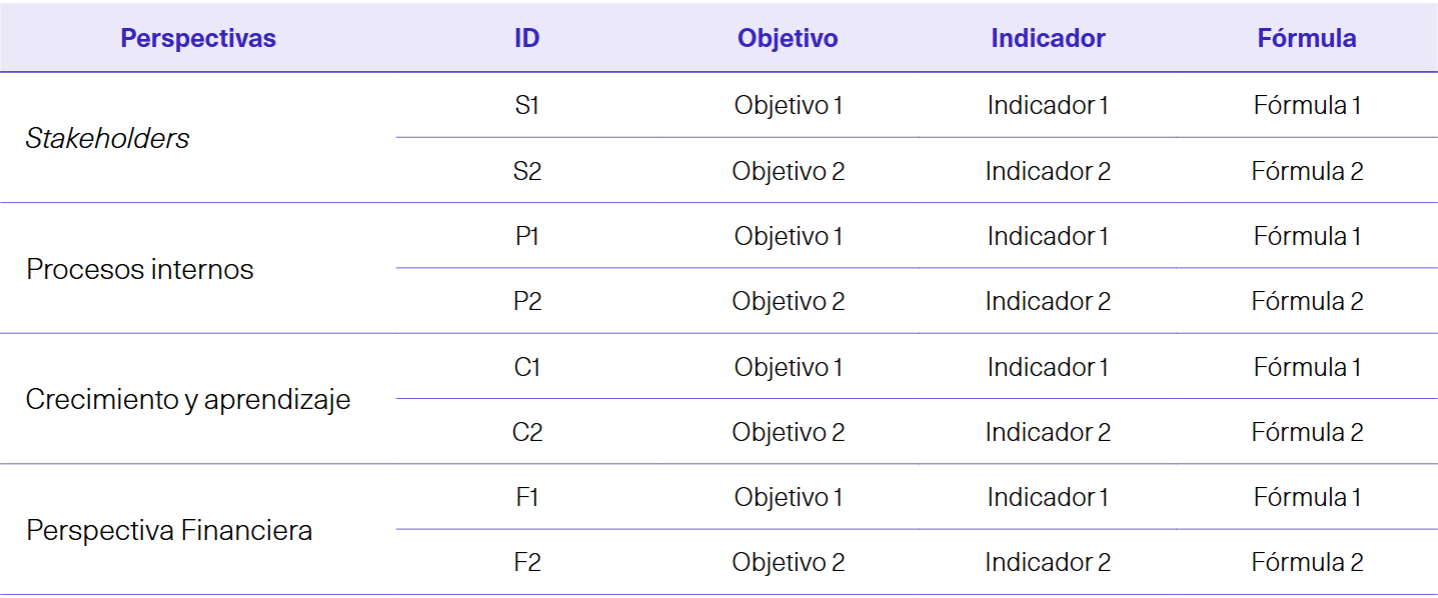 Parte importante de una correcta estrategia empresarial es la posibilidad de monitorear el cumplimiento de actividades y metas, para lo cual, Kaplan y Norton (2000) proponen el Balance Score Card (BSC, por sus siglas en inglés), también conocido como Cuadro de Mando Integral, para enmarcar las relaciones entre los activos intangibles, tangibles, objetivos estratégicos y la propuesta de valor generadas. Es una manera de representar la estrategia de la compañía y definirla a través de objetivos relacionados con sus respectivos indicadores basándose en cuatro perspectivas: financiera, stakeholders, procesos internos y aprendizaje-crecimiento (Méndez y Méndez, 2021); la Figura 6 representa un Cuadro de Mando Integral genérico para una organización. Tawse y Tabesh (2023), mencionan que la clave para establecer concordancia entre las diferentes medidas es identificar la relación causal entre los factores medibles y los objetivos a largo plazo. Aunado a lo anterior, Kaplan y Norton (2000) subrayan la importancia de asociar el BSG con un mapa estratégico, otra herramienta que visualiza las conexiones de causa y efecto, además de las mediciones que permiten evaluar el funcionamiento de la estrategia para, en caso de ser necesario, aplicar correcciones. Este modelo también es empleado por Kong (2008) en empresas con fines no lucrativos como herramienta que ayude la toma de decisiones y comunicar las estrategias establecidas.