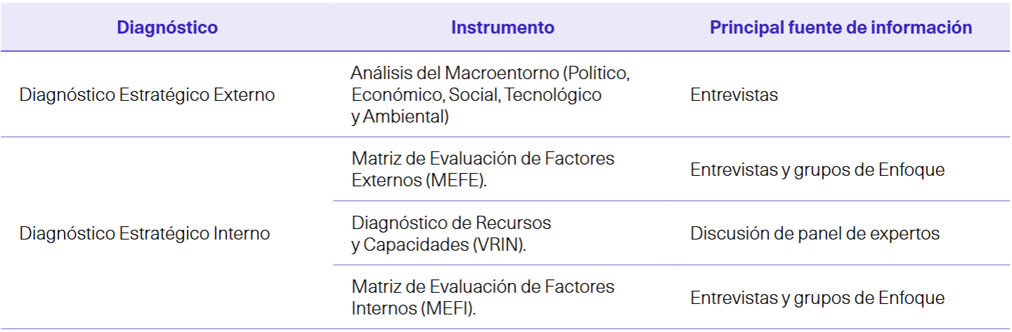 Para recabar la información requerida por instrumentos descritos se efectuaron diversos grupos de enfoque con los integrantes de la ONG, así como entrevistas individuales; mediante grabaciones de audio que permitieran, posteriormente, el análisis de esta, y construir las matrices estratégicas correspondientes. Posteriormente, se verificaron las herramientas definidas, tanto con académicos especialistas en formulación estratégica (quienes fueron seleccionados en función a sus líneas de investigación, así con experiencia previa en actividades de consultoría) y con los mismos integrantes de la OSC, en grupos de enfoque posteriores; de esta manera, se triangularon las conclusiones obtenidas para corregir las matrices y para que expresaran la real situación organizacional. La Figura 7 detalla los instrumentos aplicados para la obtención de la información correspondiente al diagnóstico externo y al diagnóstico interno.
