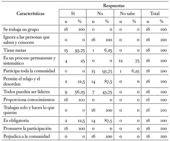 En las tablas 2 y 3 es notable que la mayoría de participantes reconoce que no toda la comunidad participa, sin embargo, todos se benefician por las gestiones del grupo, como la obtención de servicio médico en la localidad. Para 56,25 % todos pueden ser líderes y para 43,75 % no, sin profundizar sobre sus razones.