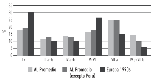 En relación con el abordaje comparativo, podemos sintetizar que la estructura de clases en América Latina presenta rasgos propios (figura 1 y tabla 1). En la década pasada1, en comparación con los países europeos, se caracterizaba por la presencia de un menor peso en toda la estructura social de la clase de servicios y de las clases manuales de mayor calificación, compensado por las clases trabajadoras agrícolas y no agrícolas de baja calificación2.