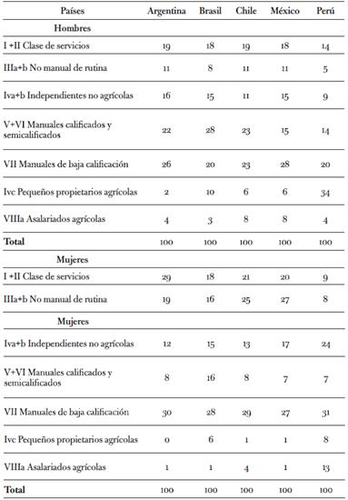 Así, Solís y Boado (2016) muestran una clara diferenciación entre México y Chile, por un lado, y el resto de los países del Cono Sur, en términos de su integración a bloques económicos regionales y a la economía global, por otro. Mientras Chile y México han mantenido una orientación política de corte neoliberal, Brasil, Argentina y Uruguay han tenido un viraje hacia gobiernos de "nueva izquierda", que hacen mayor énfasis en el crecimiento de los mercados internos y el fortalecimiento del Estado de bienestar. Perú aparece como un caso paradigmático de las condiciones existentes en una franja muy amplia de países de América Latina rara vez incluida en los análisis comparativos de estratificación social, que no presentan los niveles de industrialización y urbanización observados en los otros cuatro países y que han experimentado transformaciones estructurales recientes de gran envergadura.