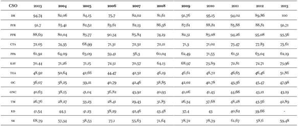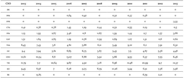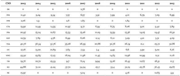 De manera complementaria, si analizamos la relación entre la percepción de descuento por obra social, prepaga, mutual, etc. (indicador de registro laboral) y estrato social, observamos que hubo un incremento generalizado y sostenido de esta, de manera particular en los estratos asalariados de la clase trabajadora y para las empleadas domésticas (tabla 8). En el caso de los primeros, los obreros calificados registrados pasaron de representar, en el 2003, un 49 % a un 67 % en el 2013, estadística que alcanza un pico en el 2012 de 73 %. Dicha tendencia también se observa de forma sostenida en el caso de los obreros no calificados. Por su parte los empleados domésticos experimentaron un aumento de 18 PP en su nivel de registro. De forma análoga al análisis inmediatamente anterior, pareciera interpretarse que este cambio se dio fundamentalmente entre el 2003 y el 2007.