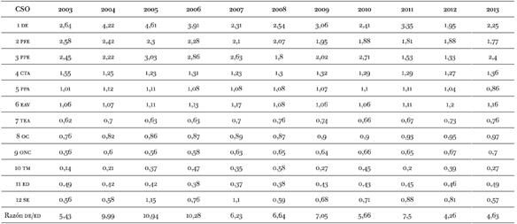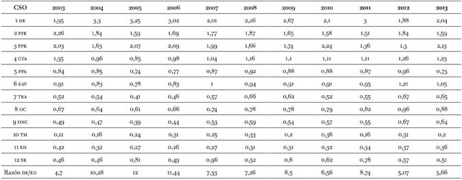 En la figura 2 se muestran las tendencias de las distancias existentes entre distintos pares de estratos seleccionados, calculadas a partir de razones de ingresos. Al analizar la brecha entre el estrato superior y el inferior (razón DE/ED), s eobserva que esta aumentó considerablemente hasta 2006, para luego bajar, con algunas oscilaciones, y adquirir en el 2013 una distancia entre estratos inferior a la del 2003. Por su parte, es notoria la disminución de la brecha de ingresos totales entre el estrato de profesionales y el de obreros calificados: si en el 2013, un individuo perteneciente al primer estrato ganaba casi tres veces y medio más en promedio que un obrero calificado, en el 2013, esa distancia se redujo a menos del doble. Por otro lado, la distancia de ingresos entre los obreros calificados y los empleados administrativos y vendedores, se mantiene aún levemente en favor de los segundos, lo que resalta el carácter difuso que adquiere la frontera manual/ no manual, al menos en términos de ingresos.