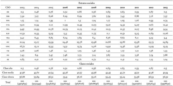 The source of information used for the research project were the microdata bases of the Permanent Household Survey (EPH, according to its acronym in Spanish) of the National Institute of Statistics and Censuses (INDEC, according to its acronym in Spanish). The social classes scheme used was built on the basis of Susana Torrado's Nomenclador de la Condición Sociocupacional (Classification of Socio-occupational Status, 1992,1998). The general objective of the article is to inquire into the changes and/or continuities in wellbeing conditions during most of the Kirchner period (2003-2013), in the framework of the class structure. Thus, it provides inputs to think about social inequality and, in the longer term, elements to revisit the effects that the socioeconomic model focused on employment had on class structure, particularly, on its composition.