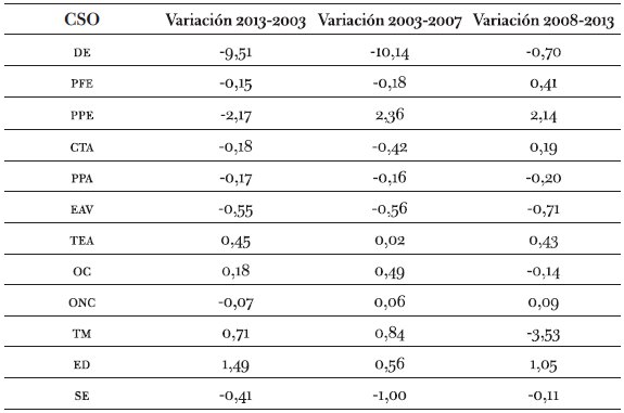 En términos generales, en relación con la evolución de la estructura de clases (tabla 4), si se compara el periodo en su totalidad, lo primero a destacar es un incremento (3,7 puntos porcentuales (en adelante PP) del estrato obrero calificado a costa de una disminución proporcional del estrato obrero no calificado. De manera particular, al observar entre periodos, el primero de la década, 2003-2007, se caracteriza por un crecimiento sostenido en 4,5 PP del estrato obrero calificado y en 1,8 PP del estrato de empleados administrativos y vendedores. Al analizar el periodo 2008-2013, las transformaciones en la estructura se atenúan, aunque con una leve disminución de los pequeños productores autónomos y un aumento de los trabajadores especializados autónomos. Ambos estratos conformados por trabajadores independientes. Por el contrario, si se considera de manera macro, las clases sociales mantienen su proporción relativa a lo largo de todo el periodo, es decir, lo que cambian son los estratos que las componen.