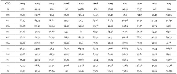 La tabla 9 presenta el porcentaje de individuos con conexión satisfactoria a servicios básicos9 por estrato. También observamos que la distribución es marcadamente desigual por estrato, en una correlación entre mayor posesión de estos servicios y los estratos mejor acomodados de la estructura social. No obstante, a lo largo del periodo estudiado se observa un incremento del porcentaje de individuos que habitan en viviendas con estos servicios en los estratos de la clase trabajadora asalariada, calificada y no calificada, y de la clase trabajadora marginal.