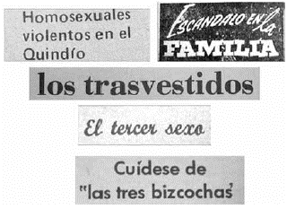 Cuando en los años sesenta emergen las noticias sobre homosexuales, estas se ubican en las páginas de sucesos sociales y judiciales, siempre asociando la homosexualidad con la criminalidad y con la transgresión del orden natural de las cosas, en otras palabras, haciendo referencia explícita a la degeneración y la depravación5. Estas visiones, según Walter Bustamante (2009), estaban presentes desde los años treinta del siglo XX en el ordenamiento jurídico, cuando "el Dr. Parmenio Cárdenas en la Comisión de Asuntos Penales y Penitenciarios preparatoria del nuevo Código Penal (1935) afirmaba que el homosexualismo ataca en sus bases fundamentales 'la moral pública y social'" (Bustamante, 2009, p. 5). De acuerdo con Bustamante, los juristas plantearon que esa era la víctima: la moral pública y social, traducida en argumentos como los "valores ideales", las "buenas costumbres", la "pública honestidad", el "buen orden de las familias", la "libertad y honor sexuales".