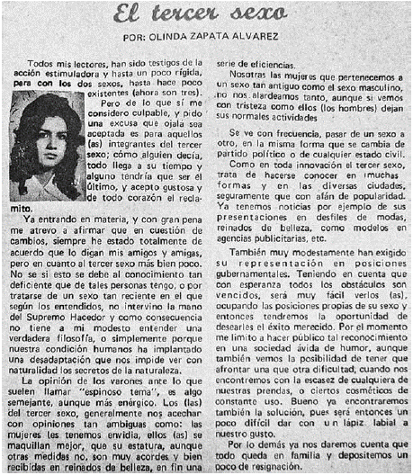 Las alusiones directas al safismo, lesbianismo o amor erótico entre mujeres fueron situaciones que no se nombraron en el Eje Cafetero, y constituyen una representación ausente. Algo similar ocurrió con el transgenerismo, que hizo su presencia en la prensa de la región hasta mediados de los años setenta del siglo XX. El cuerpo "travesti" emerge conrelatos de suplantación de mujeres, historias del tercer sexo y crímenes en las "zonas de tolerancia" (ver la figura 2). Las narraciones de lo "travesti" en la prensa, siempre de varones feminizados, reiteran la constante confusión entre prácticas homoeróticas e identidades de género, asociando la homosexualidad con quiebres a la identidad de género: el homosexual es el travesti, el que quiere ser o actúa como una mujer, el amanerado.