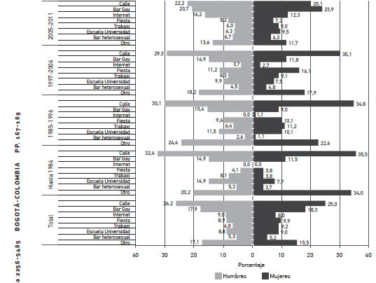 Los lugares también pueden estar indicando un proceso de institucionalización en las formas de interacción sexual. En los últimos veinticinco años se evidencia en el Eje Cafetero una mayor institucionalización de la vida erótica y afectiva entre personas con prácticas homoeróticas concentrada en los contextos urbanos7, con mayor predominio en los hombres y expresada en la preponderancia de los bares gais y la internet, en detrimento de la calle, como escenarios que posibilitan el surgimiento de relaciones de pareja. En las mujeres aún existe un predominio de los escenarios de interacción socio-sexual "cara a cara" (ver la figura 3).