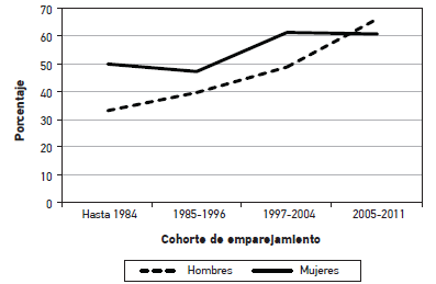 La figura 4 revela un incremento paulatino del conocimiento de la relación de pareja por parte de la familia. Para los hombres, pasa del 32 % al 65,9 %, y para las mujeres, empieza en un 53,6 % hasta llegar a un 60,8 % en la última cohorte. El proceso de coming out8, como experiencia colectiva propia de la cultura gay-lésbica y, la estructura familística de la sociedad colombiana tienden a derivar en una articulación no antagónica del emparejamiento entre personas del mismo sexo en el esquema de la "gran familia parental" y, por 10 tanto, en su institucionalización como una forma alternativa de proveer afecto y cuidado a alguno(s) de su miembros.