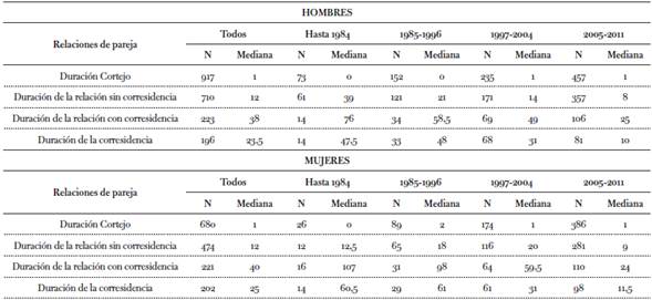 En cuanto a la duración de las relaciones de pareja en los últimos 35 años, se halló que los emparejamientos entre varones y mujeres, con y sin corresidencia (ver la tabla 1), duraron más en los momentos de mayor crecimiento de la epidemia del VIH-SIDA y tienden a disminuir en el último periodo analizado. La presencia de la epidemia es un factor por considerar en el establecimiento de relaciones de pareja de mayor duración que apostaron por la corresidencia o cohabitación, aunado al tipo de acuerdo sexual cerrado que ha predominado en la construcción de este tipo de emparejamiento.