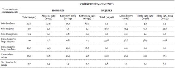 El patrón de emparejamiento exclusivo con mujeres está presente en el 36,8 % de las encuestadas, tipología ascendente entre cohortes, situándose en el 42,8 % para las mujeres jóvenes. Para el caso de los varones, este tipo de trayectoria tiene una baja participación (2,0 %), la cual es constante entre generaciones.